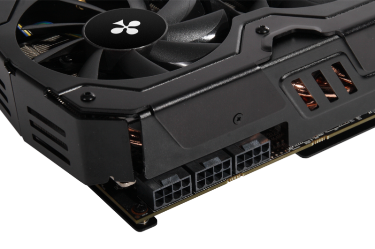 A conferma della potenza assorbita dalla scheda troviamo 3 connettori da 8 pin. Le dimensioni ed il peso sono mastodontiche: la scheda è lunga 308mm e pesa 1792g. Per ovviare a questo problema, che rende rischiosa l'installazione in classici cabinet che prevedono l'installazione della scheda video in configurazione orizzontale, Club 3D provvede nel bundle un supporto estensibile, volto a sorreggere il peso della scheda nella sua estremità destra.