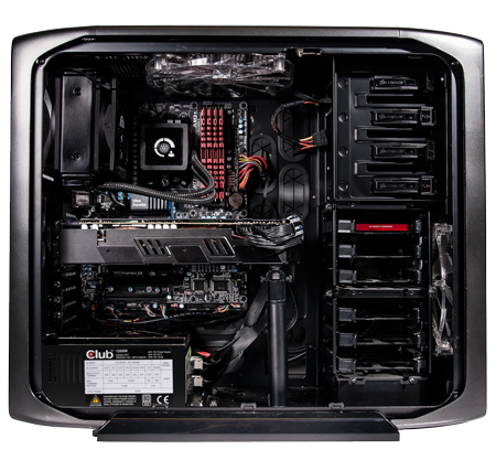 La frequenza di esercizio è stata fissata a 900 MHz per ciascuna GPU mentre un pulsante sul retro della scheda permette di passare alla modalità overclock, con frequenze a partire da 925 MHz. Il sistema di dissipazione triventola (2x92mm + 1x80mm) occupa tre slot e ha l'arduo compito di dissipare i ben 500W di TDP della scheda. Stando alle dichiarazioni di Club 3D il dissipatore è in grado di mantenere una temperatura di 65°C sotto carico (3D Mark 11) con una rumorosità di soli 33.9 dBA, merito anche delle ben 10 heatpipe con cui è realizzato.