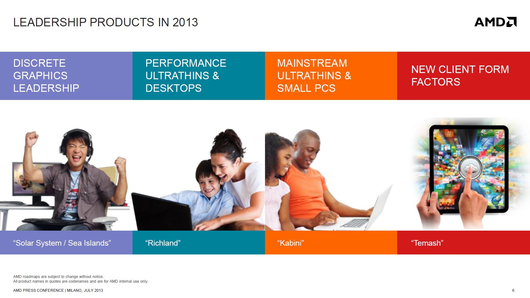 La proposta di AMD è piuttosto completa e si propone di coprire tutte le esigenze, dai consumi contenuti e l'alta efficienza richiesti in sistemi ultra-portatili come smartphone e tablet, all'elevata potenza di calcolo richiesta in un PC Desktop, inoltre AMD sarà in grado di soddisfare le esigenze di aziende che necessitano prodotti personalizzati per adattarsi meglio alle loro esigenze (come già successo con Sony per la PlayStation 4).