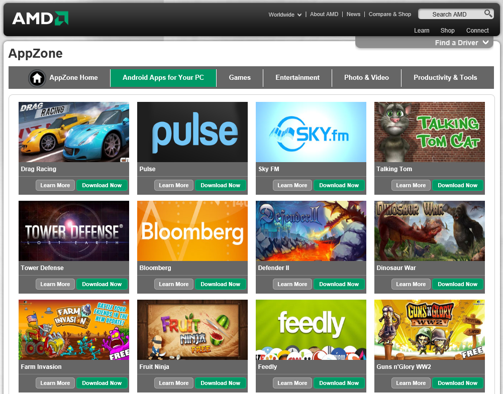 AMD AppZone, che offre un numero di app superiore rispetto a qualsiasi altro app store, è inoltre disponibile per l’ampia gamma di computer AMD basati su Windows 7. Gli utenti possono facilmente accedere alla vasta collezione di app con un semplice click sul sito AMD AppZone all’indirizzo: http://www.amd.com/us/vision/shop/cool-app/pages/cool-app.aspx e scegliere tra le app suggerite, disponibili gratuitamente per il download. Le app sono fruibili in diverse lingue, tra cui inglese, tedesco, coreano, cinese, francese, italiano, spagnolo e portoghese, e divise nelle categorie giochi, social, news, shopping, musica, business ed educational.