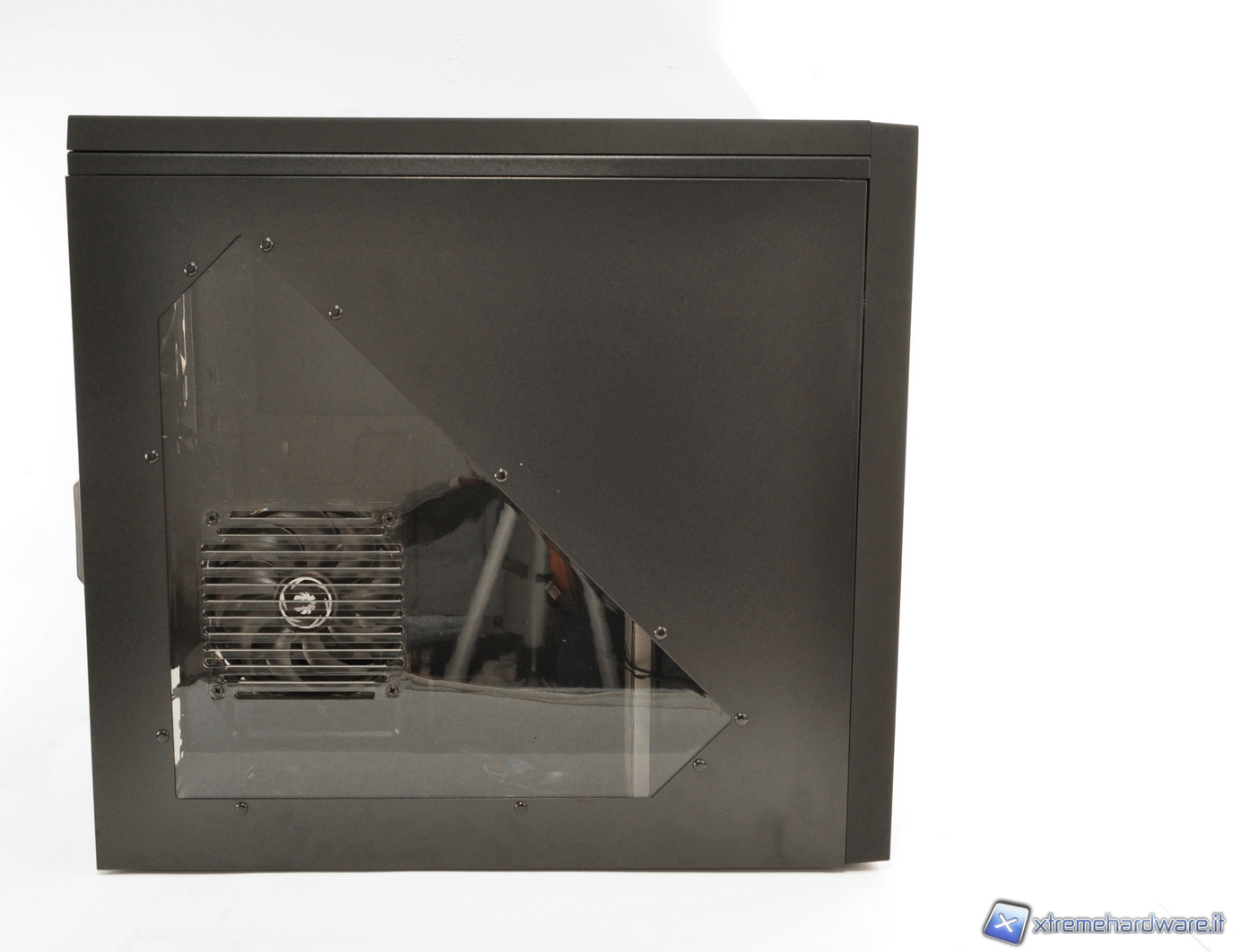 La paratia laterale del case presenta un’apertura con un angolo di 90° che ci consente di guardare e poter ammirare l’hardware montato dentro al nostro pc. Nella paratia è inoltre possibile montare una ventola da 120mm in estrazione.