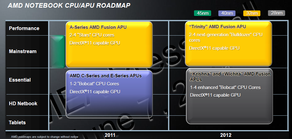 Nel segmento mobile AMD ha già mostrato tutte le sue carte per il 2011, presentando oggi Sabine, dopo il successo del lancio di Brazos nei mesi scorsi. Il 2012 vedrà l'introduzione delle stesse APU del segmento Desktop: Trinity, con Bulldozer e Krishna e Wichita con core Bobcat. Il passaggio a 28nm su queste ultime due piattaforme permetterà di incrementare l'efficienza di queste APU che probabilmente approderanno in molti Tablet e dispositivi mobile.