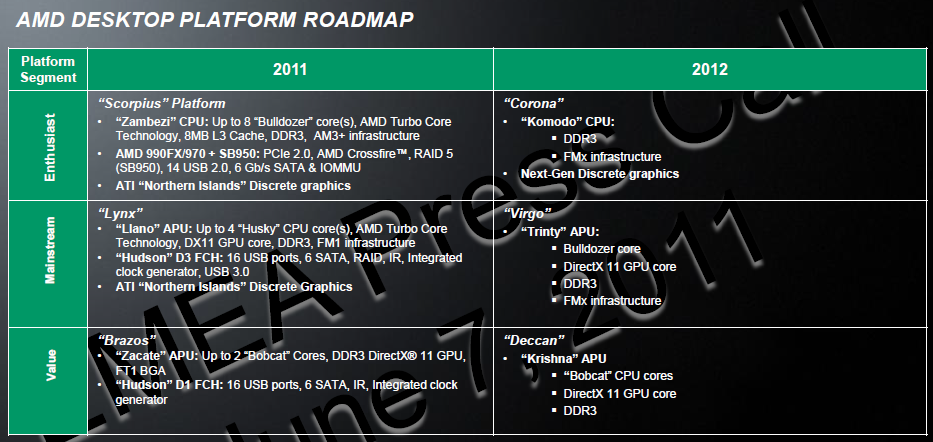 Sembra che l'uscita delle CPU Zambezi sia stata rimandata a fine agosto, mentre nei prossimi giorni, sempre per quanto riguarda le piattaforme Desktop saranno rese disponibili le specifiche delle APU Llano “Lynx”.