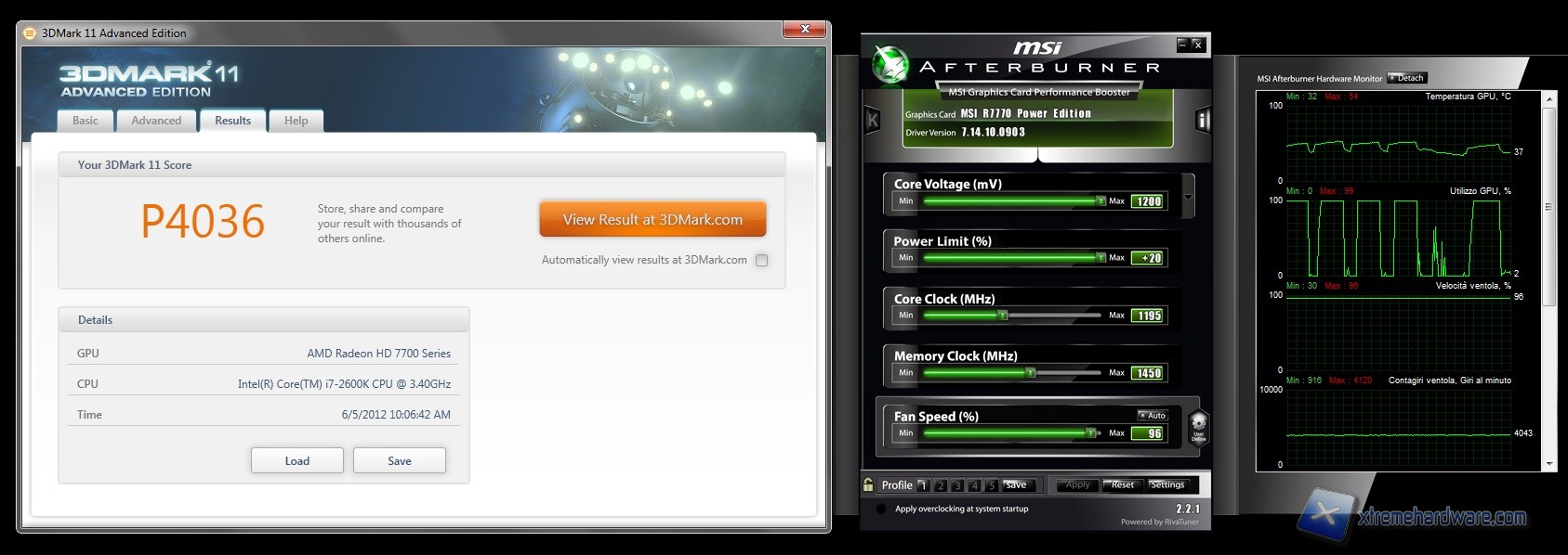 Utilizzando il noto tool software MSI AfterBurner, abbiamo eseguito varie prove sulla R7770 Power Edition. La prima è stata la ricerca della massima frequenza stabile per GPU e memorie non intervenendo con l'overvolt, mentre nella seconda prova abbiamo impostato voltaggi e frequenze adeguate per trovare la massima frequenza stabile utilizzando il raffreddamento ad aria stock della scheda ma in configurazione Dual Fan, che ha la migliore resa per quanto riguarda le temperature d'esercizio.